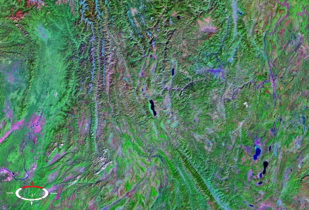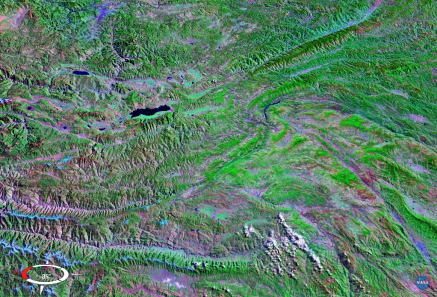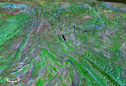 画面左上角からカーブして下方向(南)に伸びているヒマラヤからの山並みと、